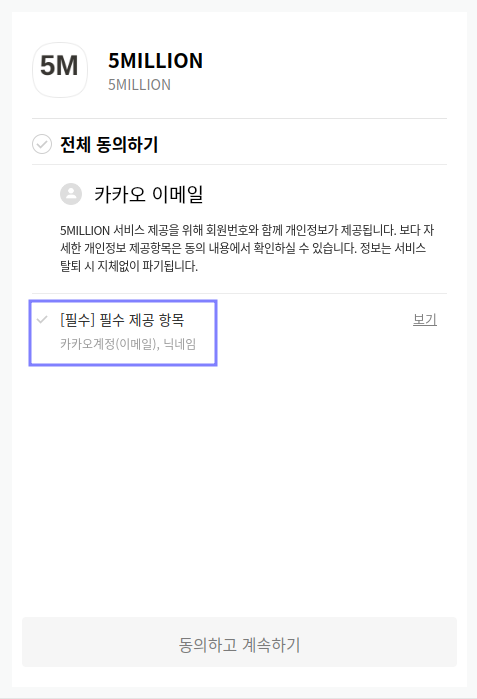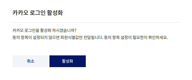 위와 같은 모달창이 뜨면서 동의 항목이 설정되지 않으면 회원식별값만 전달된다고 안내한다. 여기서 회원식별값은 카카오아이디를 의미한다. 카카오 서비스를 이용하기 위한 이메일이 아니고 1, 2, 3 과 같은 숫자로 이루어진 유저마다 가진 고유한 값이다.