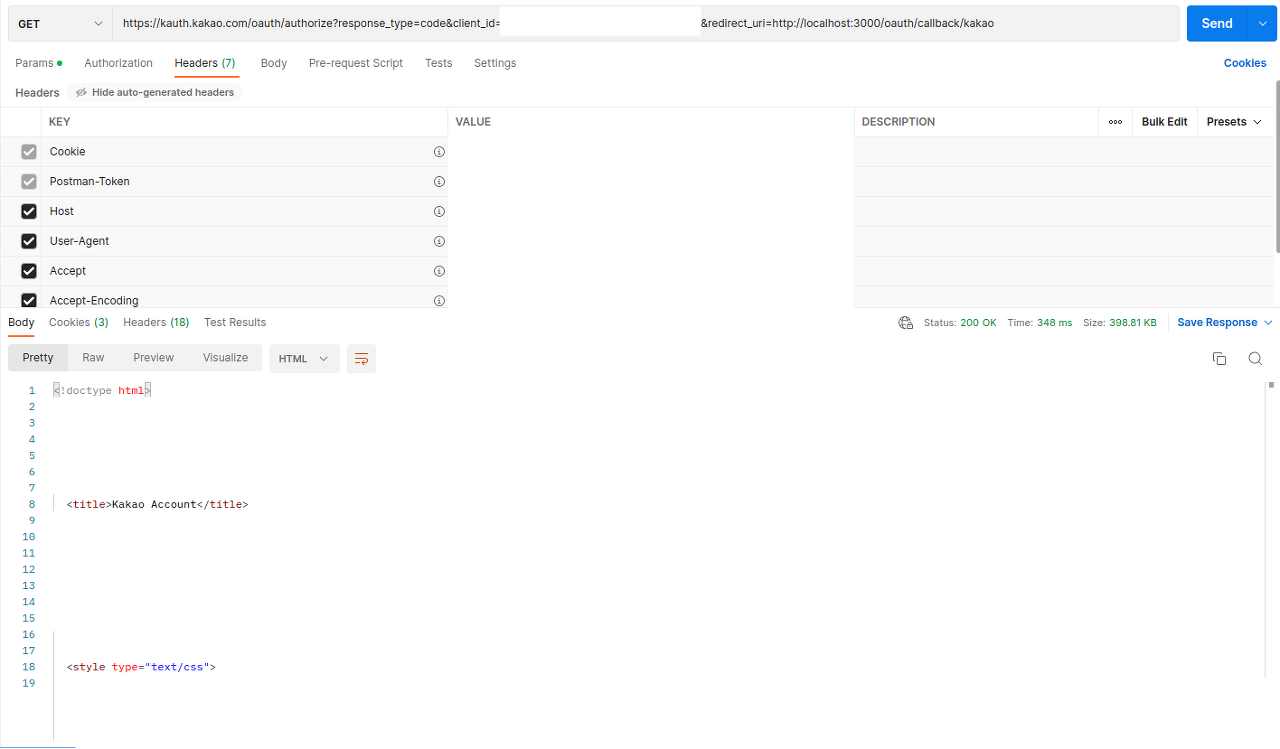 GET 요청을 보내면 위와 같은 응답이 출력된다. 이때 인가 코드를 받기 위해서는 GET 요청을 보낸 URI를 그대로 복사하여 브라우저에 입력해야 한다. 그럼 위에서 봤던 카카오 로그인 화면이 실제로 뜰 것이다.