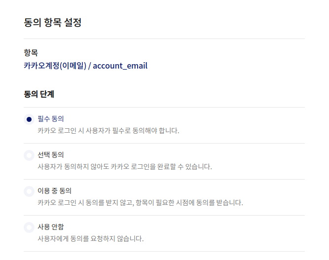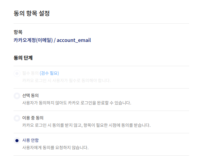 이 절차를 무시해도 카카오 로그인 서비스를 이용할 수 있지만 보통 소셜 로그인을 하는 이유는 아이디대신 이메일을 사용하려는 경우가 많기 때문에 하는 편이 좋다. 만약 인증하지 않으면 카카오 로그인 시 사용자가 필수로 동의해야 합니다. (검수 필요) 라는 문구와 함께 비활성화된 라디오 버튼을 볼 수 있을 것이다.