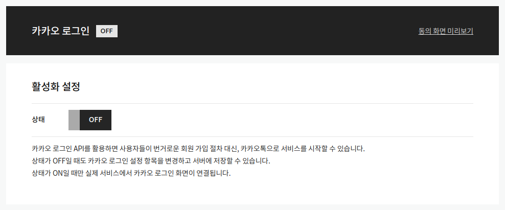 제품 설정 > 카카오 로그인에 들어가 카카오 로그인을 활성화 설정해준다.