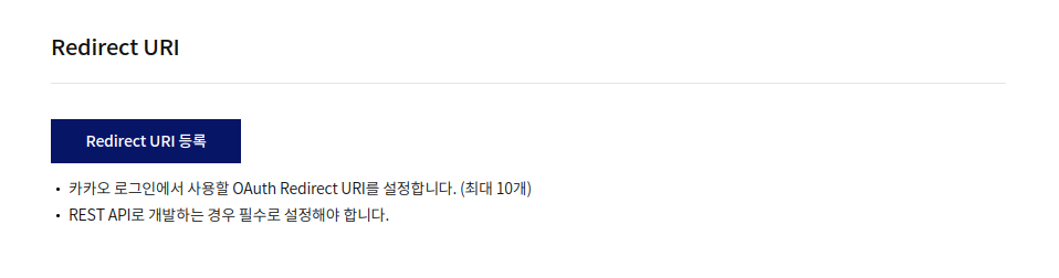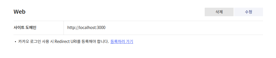 사이트 도메인 주소가 없다면 http://localhost:3000을 사용한다. 저장하면 아래와 같이 Redirect_URI를 설정하라는 안내가 뜬다.
