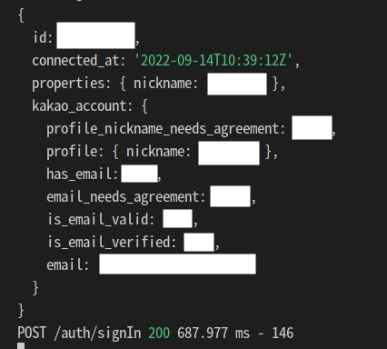 axios 요청을 보내면 객체 형태로 응답을 받을 수 있다. 카카오 토큰을 담아 해당 API를 실행시키고 console.log(result.data)은 다음과 같이 출력된다.