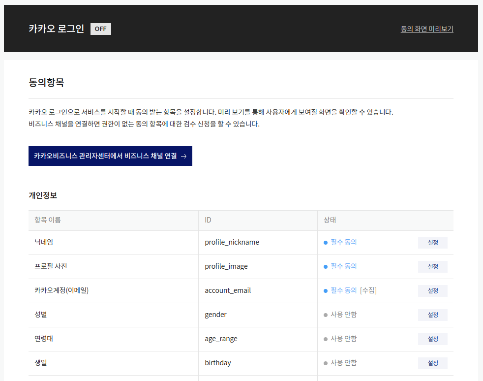 비즈 앱으로 전환하면 개인 개발자 비즈 앱 전환탭이 카카오비지니스 관리자센터에서 비즈니스 채널 연결로 바뀌게 된다. 이제 다시 왼쪽 메뉴 탭에서 제품 설정 > 동의 항목을 눌러 이메일 설정을 눌러보면 아래와 같이 필수 동의 라디오 버튼이 활성화된 것을 확인할 수 있다.