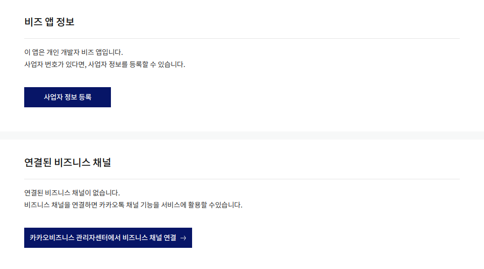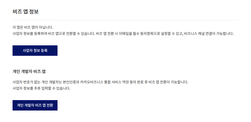 정리하자면 사업자등록을 하라는 말이고, 사업자 번호가 없다면(개인 프로젝트용) 본인인증과 카카오비즈니스 통합 서비스 약관 동의를 해야 한다. 더 간단하게 말하면 우리 서비스를 사용하려면 당신을 신뢰할 수 있게 본인 인증하는 절차이다.