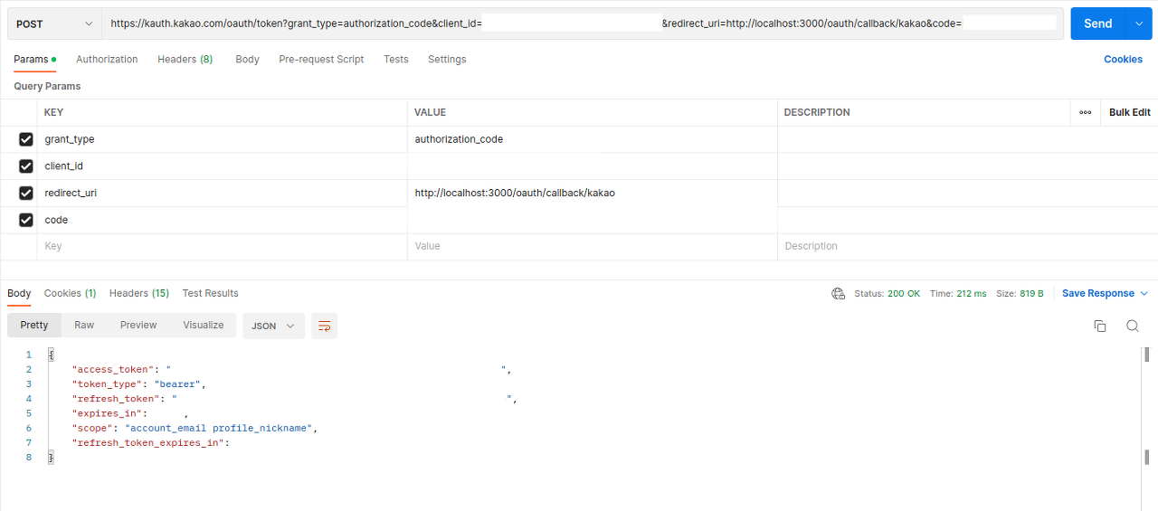 https://kauth.kakao.com/oauth/token?grant_type=authorization_code&client_id=어쩌고 저쩌고&redirect_uri=http://localhost:3000/oauth/callback/kakao&code=복사한 인가 코드