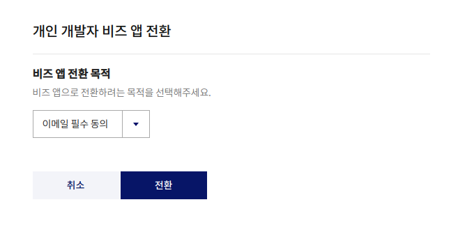 개인 개발자 비즈 앱 전환을 누르면 아래와 같이 목적을 적는 항목이 나오는데 본인의 목적에 따라 알맞게 작성해주면 된다. 일반적으로 이메일 필수 동의를 위해 사용하므로 해당 항목에 체크하고 전환하도록 했다.
