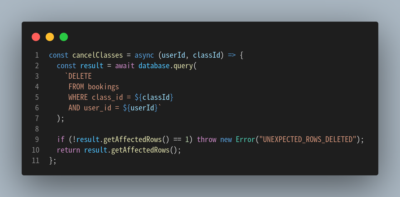 예약한 수업을 취소하는 Dao단의 함수로 result.getAffectedRows() 결과가 1(true)이 아니면 에러를 발생시켰다. 실제로 0개의 row가 삭제되었을 때 직접 처리해준 에러 메시지가 반환된 것으로 보아 정상적으로 에러 핸들링이 된 것을 알 수 있었다. OkPacket을 이용하면 DELETE뿐만 아니라 다른 메소드에서도 몇개의 rows가 영향을 받았는지를 통해 에러 핸들링 및 여러 로직을 구상할 수 있다.