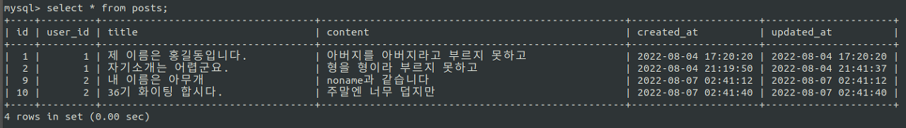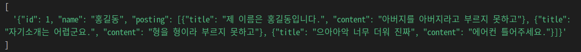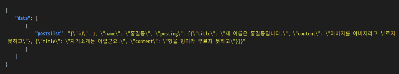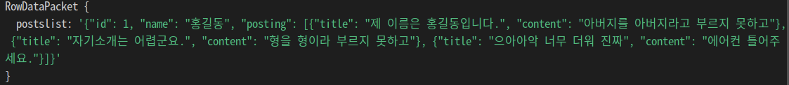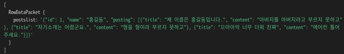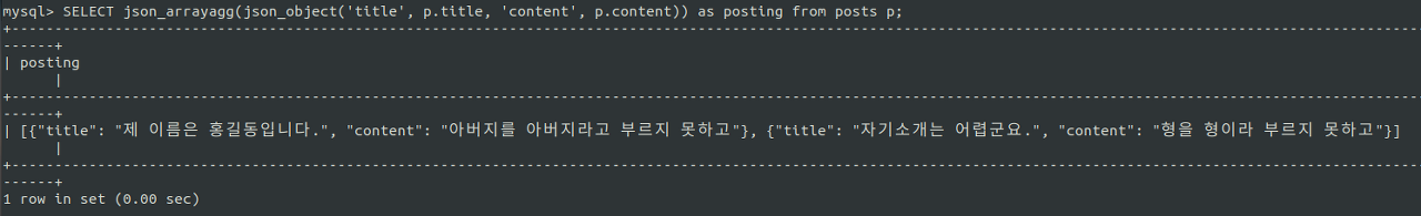 GUI를 사용하지 않고 터미널 상에서 mysql을 출력하였더니 결과가 깔끔하게 보이진 않지만 결과는 제대로 나왔다. 이번엔 JSON_ARRAYAGG를 사용하여 여러 객체를 하나의 JSON 배열로 묶었다. 게시글은 여러개이므로 위의 회원을 객체로 불러왔던 것처럼 JSON_OBJECT로 하나씩 객체로 만들어준 후 이들을 posting이라고 별칭지어 배열에 담았다. 이제 회원 아이디와 게시글을 묶어 하나의 JSON 형태로 출력하는 일만 남았다.