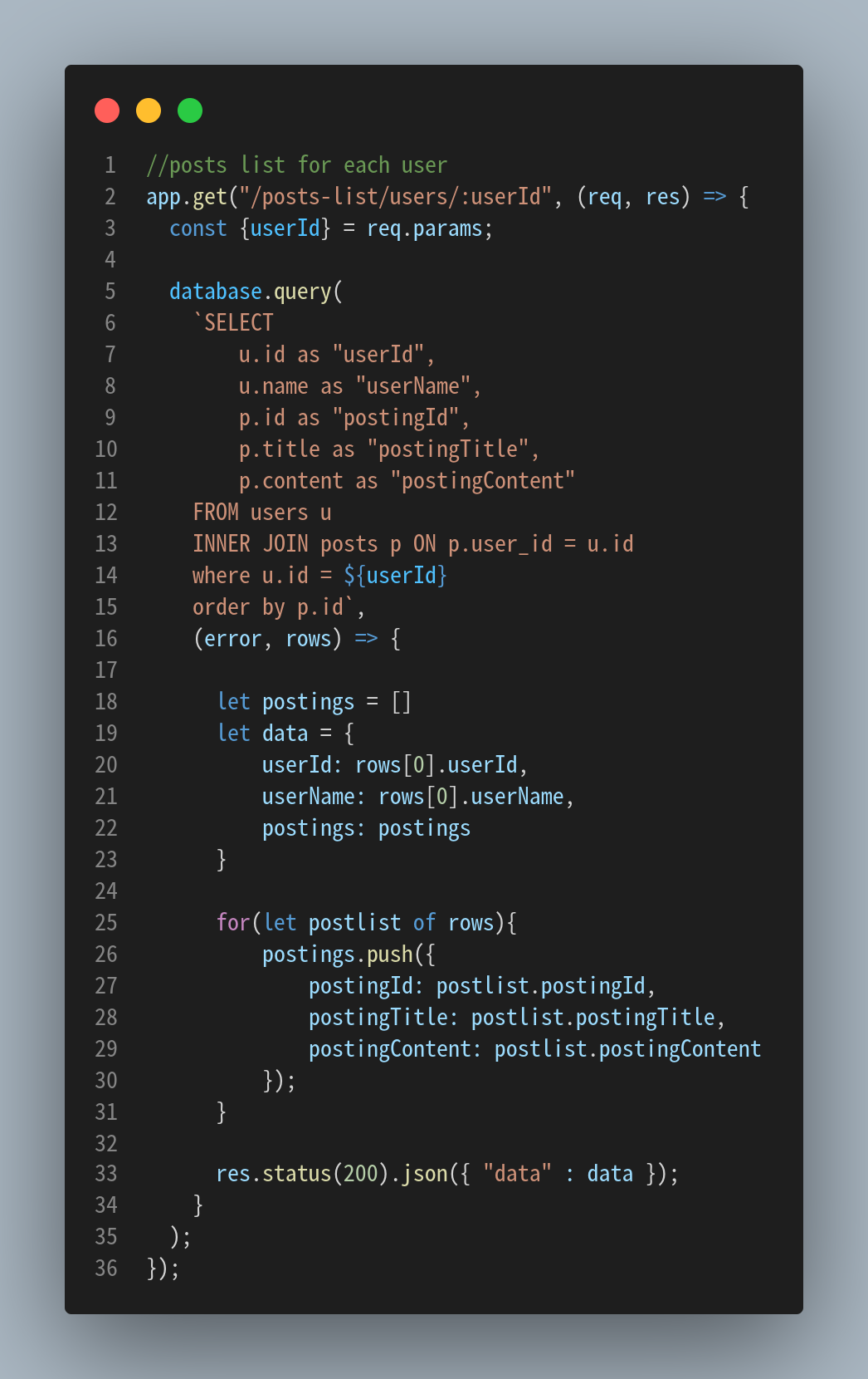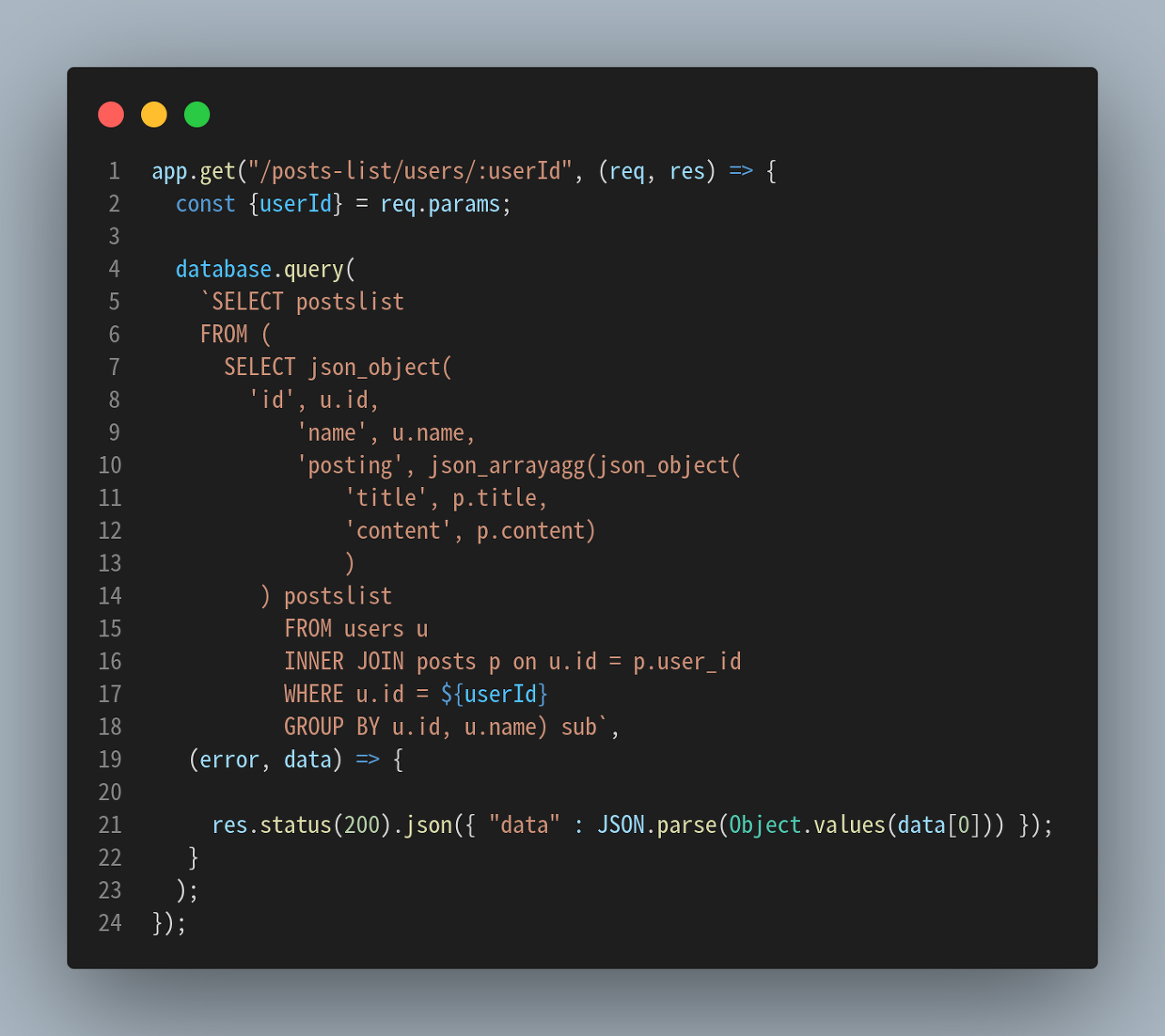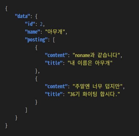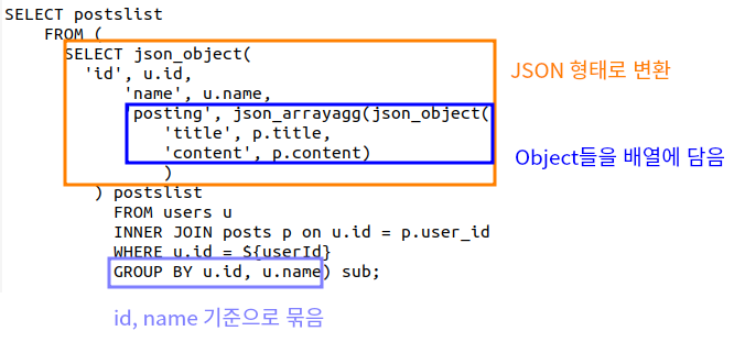 그전에 GROUP BY를 알아야 한다. 말 그대로 특정 컬럼(들)을 그룹화하여 출력하라는 조건을 달아주는 것이다. 만약 1번 사용자의 정보와 게시글만 가져오는 것이 아닌, 모든 사용자들의 정보와 게시글을 가져오는 것이라면 users 테이블의 id, name을 그룹화하여 위의 사진처럼 불러올 수 있게 된다. 즉, id, name을 같은 것들끼리 묶어 나머지 데이터를 출력해준다. 1번 id를 가진 사용자의 게시글을 묶고, 2번도 마찬가지 또 n번째 사용자도 똑같은 객체 형태로 출력한다. 현재 우리는 한명의 사용자의 게시글들만 불러오면 되기 때문에 필요없는 쿼리문이기는 하다. 그러나 유용하게 쓰이므로 알아두는 것이 좋다.