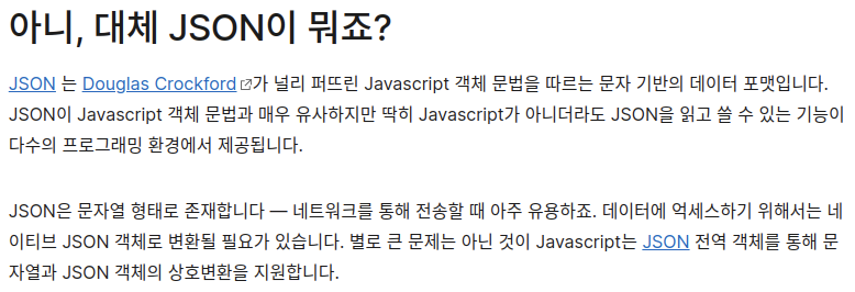 JSON(JavaScript Object Notation)은 Javascript 객체 문법으로 구조화된 데이터를 표현하기 위한 문자 기반의 표준 포맷입니다. 웹 어플리케이션에서 데이터를 전송할 때 일반적으로 사용합니다(서버에서 클라이언트로 데이터를 전송하여 표현하려거나 반대의 경우)._