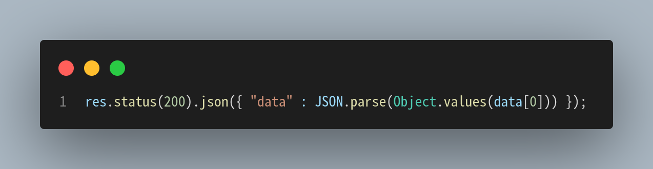 결과를 그저 하나의 문자열로 인식해버린다. 고로 쿼리문으로 객체의 형태까지 만들 수 있었지만 전혀 전처리 없이 데이터만을 바로 반환할 수는 없었다. 하지만 전보다 훨씬 간단한 한줄의 코드이기에 사용하는 의미가 있다고 생각한다. 항상 JSON과 JS Object를 혼동하였는데 이번에도 그런 경우였다.