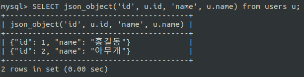SELECT JSON_OBJECT('key값', 컬럼명) FROM 테이블;