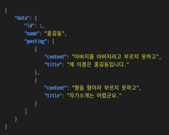 만약 사용자가 내가 쓴 글을 보려고 마이페이지에 들어가 내가 쓴 글을 조회한다면 우리는 어떻게 데이터를 넘겨줘야 할까. 보통 데이터를 주고 받을 때 Json, xml 형태로 가장 많이 자료를 넘긴다. 애초에 둘 다 데이터를 저장하고 전달하기 위해 만들어진 형태이기 때문이다. 또한 계층적인 데이터 구조를 가지기 때문에 한번에 얽혀있는 정보들을 표현할 수 있다는 장점이 있다.