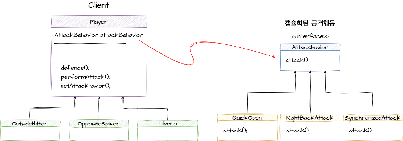 가장 중요한 점은 공격하는 행동을 Player 클래스에서 정의한 메소드를 사용하지 않고 다른 클래스에 일임한다는 것이다.