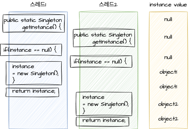 스레드1, 스레드2에서 각각 getInstance()를 호출했을 때 다음과 같이 인스턴스 2개가 만들어진 것을 볼 수 있다. 하나의 인스턴스만 만들도록 설계된 환경에 이런 문제가 생긴다면 자칫 큰일이 날 수 있다. 다행히도 멀티스레드 환경에서도 인스턴스가 1개이상 만들어지지 않도록 제한할 수 있는 방법이 있다.