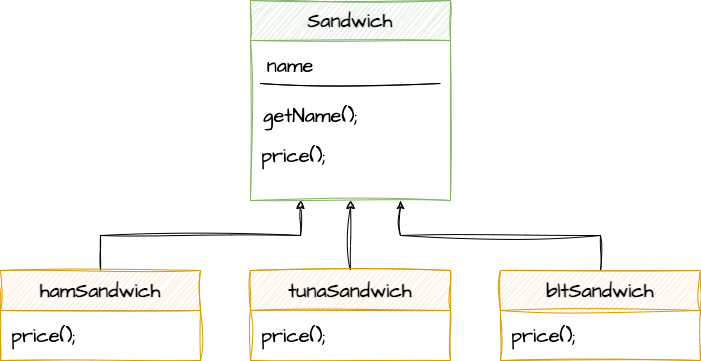 샌드위치 가게에서 주문을 한다고 하자. 예를 들면 토핑 주문 지옥이라는 서브웨이. 모든 샌드위치들은 Sandwich 추상 클래스의 서브클래스가 된다. price() 메소드는 추상 메소드이고 서브클래스는 이 메소드를 구현해야 한다. name 인스턴수 변수는 서브 클래스에서 정해지고 getName() 메소드를 통해서 호출해서 정해진 이름을 알 수 있다.