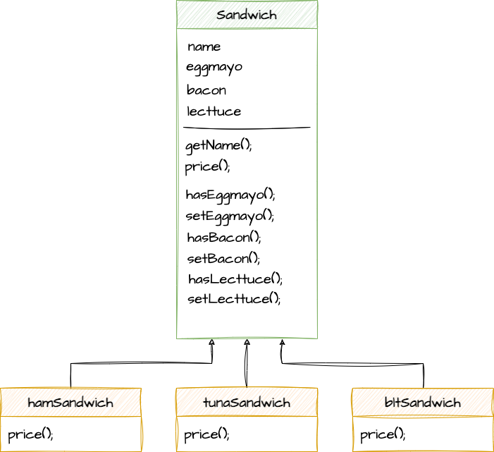 햄 샌드위치, 참치 샌드위치, blt 샌드위치에서는 가격을 반환하는 price() 메소드를 구현해야 한다. 하지만 햄, 참치 등은 기본 재료이고 여기에 에그마요, 베이컨, 양상추 많이 등을 더하고 싶을 수도 있다. 각각의 추가 토핑마다 가격도 상이할 것이다. 그래서 에그마요를 추가한 햄샌드위치, 양상추를 추가한 참치 샌드위치, 베이컨과 양상추를 추가한 햄샌드위치 등과 같이 서브클래스를 만들었다. 하지만 이런식이라면 금방 수천개의 클래스가 탄생하게 된다.