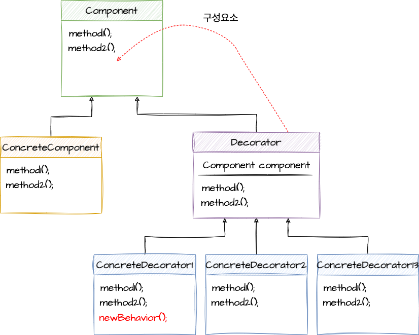 Component : 구성 요소 (그냥 사용하거나 데코레이터로 감싸서 사용), Decorator와 ConcreteComponent 사이의 인터페이스.