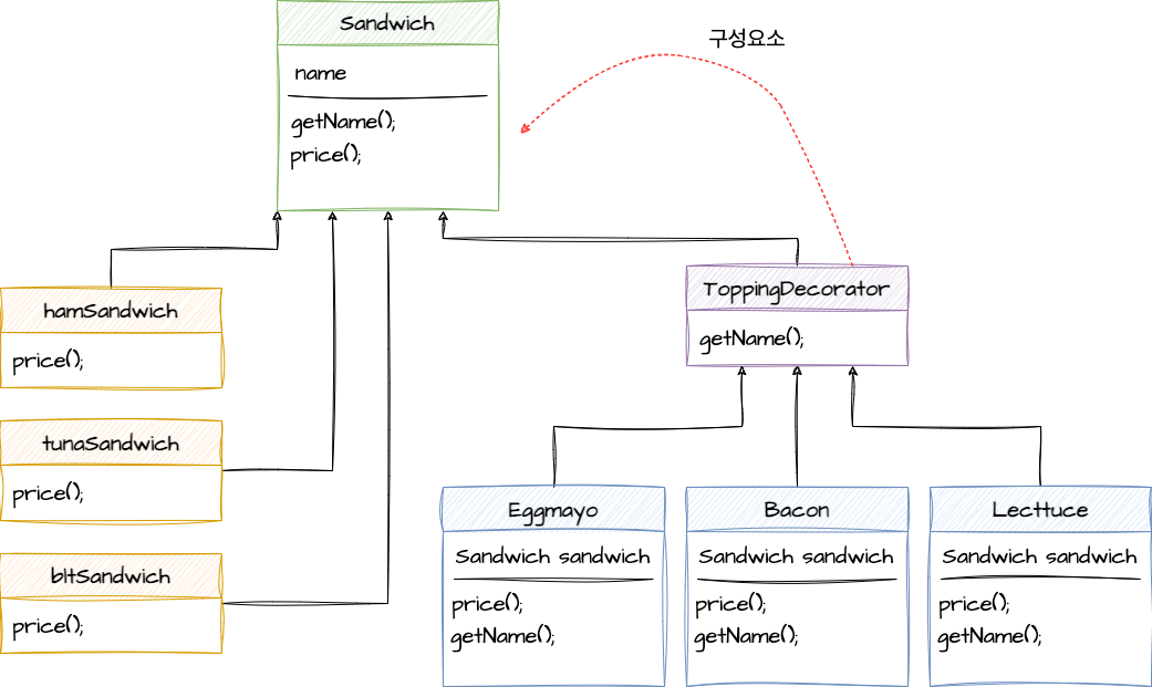 각 샌드위치의 종류마다 구성 요소를 나타내는 구상 클래스를 만들고, 토핑들은 데코레이터로 작용한다. price()와 getName() 메소드도 구현해야 한다. 이제는 그냥 햄 샌드위치가 아닌, 양상추를 추가한 햄 샌드위치 라고 부를 것이기 때문이다.