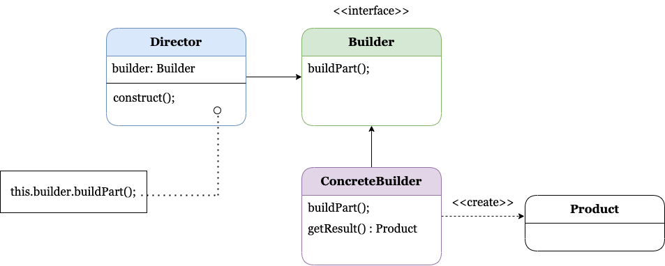 제품을 여러 단계로 나눠서 만들도록 제품 생산 단계를 캡슐화한다. 프로그래밍 할 때 가장 많이 쓰이는 때는 복잡한 객체를 생성하는 순간이다. 특히 선택적인(Optional) 속성이 많을 때 유용하다.