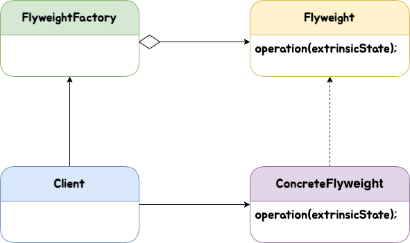 - ConcreteFlyweight : Flyweight 인터페이스의 서브 클래스 (실제로 사용될 객체)