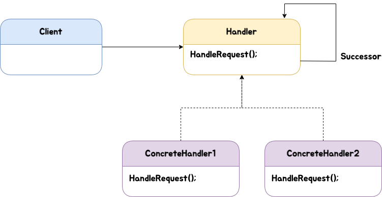 Handler는 요청을 처리하는 인터페이스를 정의하고, Successor라고 불리는 후속 처리자와의 연결을 구현한다. 위 코드에서는 Node가 되겠다. Handler를 구현한 ConcreteHandler는 자기가 처리할 일이라면 처리하고 아니면 후속 처리자에게 요청을 보내 위임한다. 이렇게 알맞는 처리자를 찾을 때까지 이동하다가 처리된다.