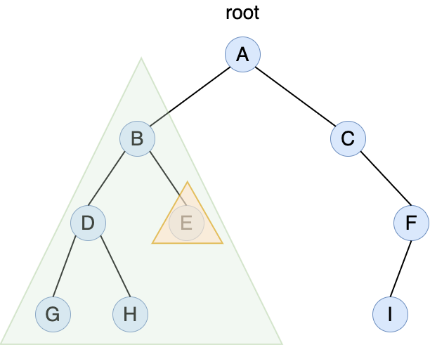 그 다음 오른쪽 트리인 E를 읽는다. 더 이상 서브 트리의 하위 노드가 없으므로 초기의 루트 노드로 돌아가서 A를 읽는다. 그 다음 C가 루트 노트처럼 되고, 왼쪽 서브 트리가 없으므로 C를 읽는다. 다시 오른쪽 서브 트리로 중위 탐색을 한다. F가 루트 노트처럼 되고, 왼쪽 서브 트리인 I를 읽는다. 이후 루트 노드인 F를 방문한다.