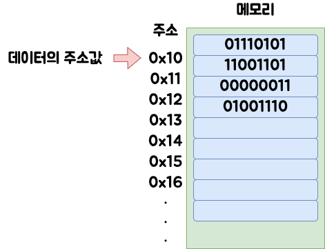 메모리의 주소값을 저장하는 변수이다. 이 변수에 어떤 값의 주소를 제공해주면 해당 주소를 가리키고, 이를 따라 접근도 가능하다. char형 변수는 문자를 저장하고, int형 변수는 정수를 저장하는 것처럼 포인터는 주소값을 저장한다.