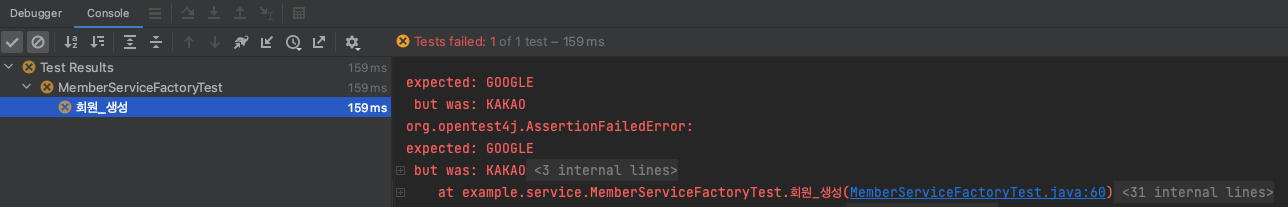 KAKAO 플랫폼을 넘겼을 때 정말 KakaoMemberService의 인스턴스를 반환하는지 점검하는 테스트 하나, 정말로 KakaoMemberService 인스턴스를 사용하여 Member를 생성하고 있는 건지 점검하는 테스트 하나를 작성했다.