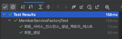 내용을 살펴보면 ServiceLocatorFactoryBean 인스턴스를 생성하고, setServiceLocatorInterface 메서드를 사용하여 해당 인스턴스에 MemberServiceFactory 인터페이스를 지정했다. 이제 ServiceLocatorFactoryBean이 해당 인터페이스의 구현체를 검색한다. 마지막으로 반환을 하면 스프링 컨테이너가 이 메서드가 생성한 Bean을 관리한다. 이제 기존의 테스트 코드에 위 MemberServiceFactory 인터페이스를 주입 후 검증하면 결과는 동일하다.