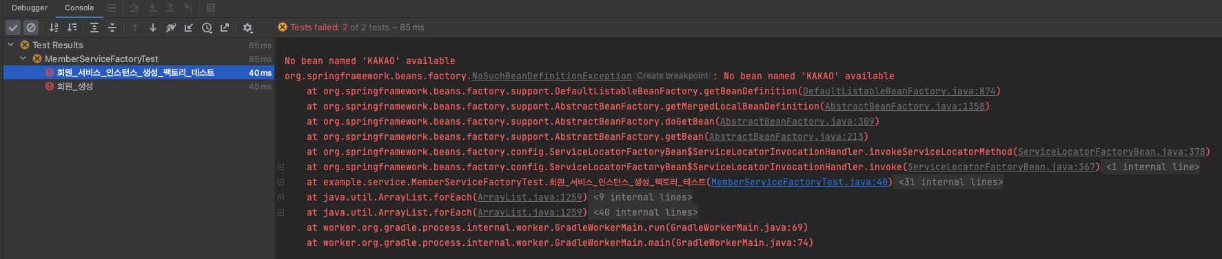 앞서 말했던 @Service에 지정해 줬던 Bean name이 없다면 어떤 현상이 일어날지 보여주겠다. 현재 Test에서 KakaoMemberService의 인스턴스를 이용하고 있으니 해당 클래스의 Bean name을 지우고, 다시 검증했다.