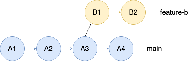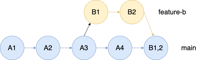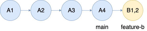 main 브랜치에서 A1, A2... 라는 작업을 하고 B 기능을 구현하기 위해 feature-b 브랜치를 생성했다. 다음과 같은 상황에 merge, rebase, squash을 적용한 상황을 예시로 들겠다.